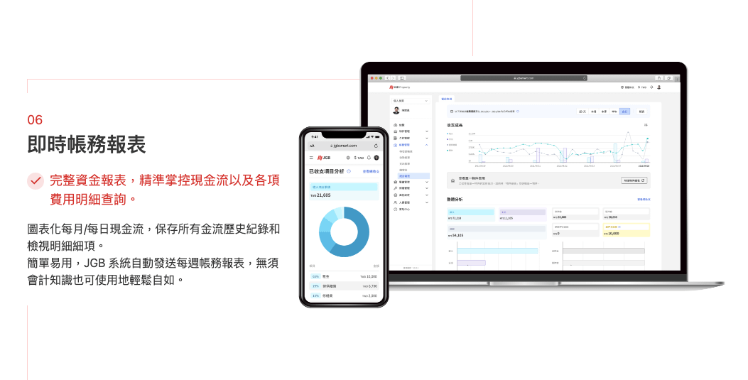 智能帳務分析:財務工具(如JGB)可以即時生成月度、季度或年度財務報表,協助業主監控物業收入與支出。